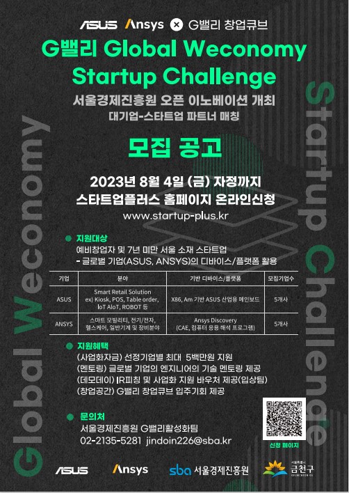 서울경제진흥원(SBA)에서는 우수 스타트업 지원 및 G밸리 유치를 위해 글로벌 기업인 ASUS, ANSYS와 협력하여, 오픈이노베이션 프로그램인 ‘G밸리 Global Weconomy Startup Challenge’를 추진하고자 하오니 관심있는 분들의 많은 참여를 바랍니다.