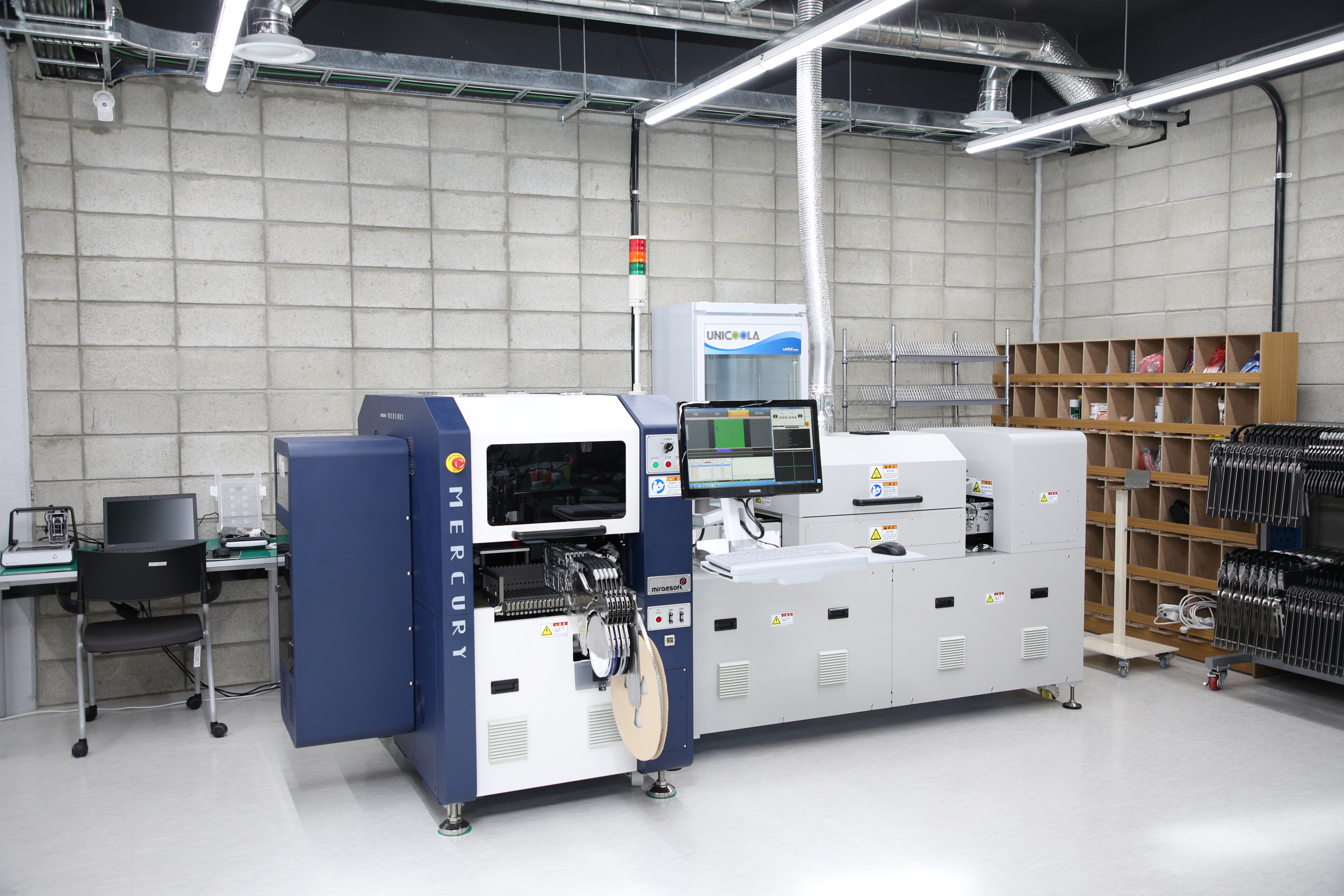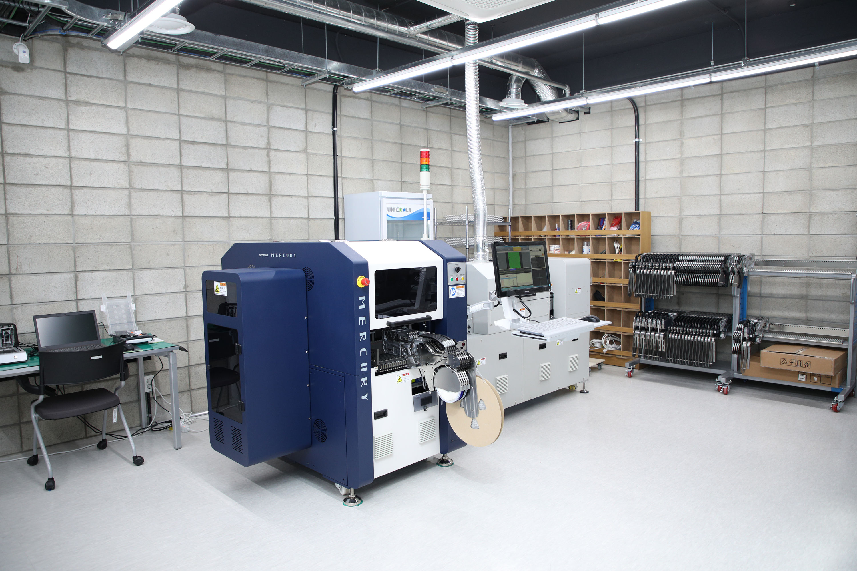 PCB 프린터, SMT 장비, 납땜 장비가 설치된 곳입니다. PCB 프린터는 5대를 보유하고 있습니다.